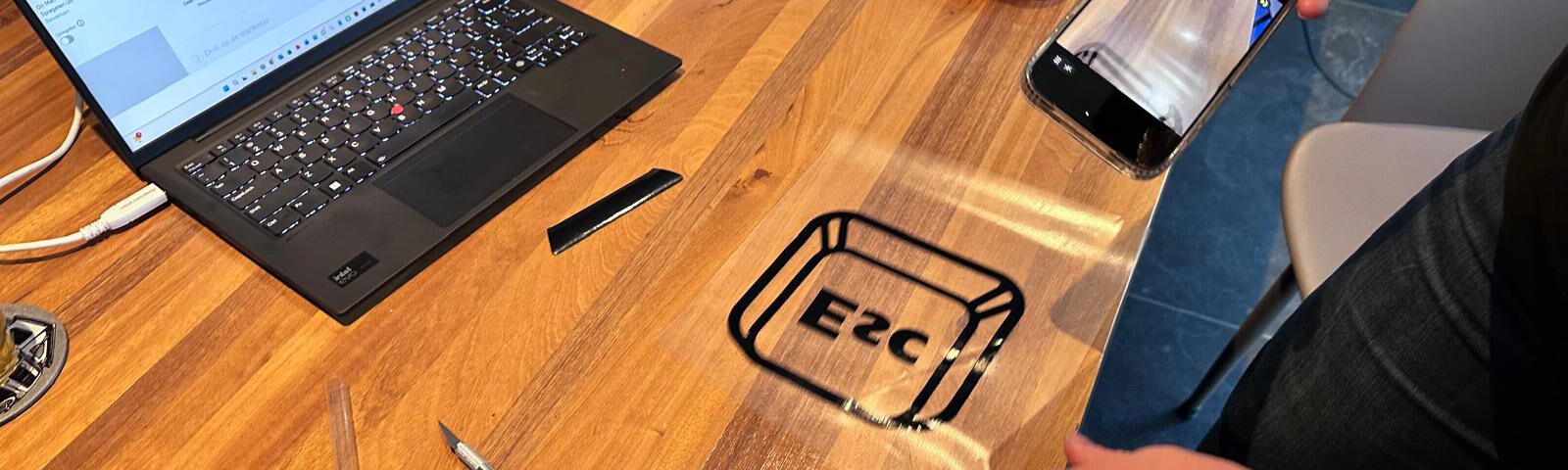 De sticker positioneer ik zorgvuldig, breng hem rustig aan en geef overal gelijkmatige druk. Daarna trek ik de transferfolie weg. Het ontwerp blijft strak achter op de klep. Klaar. Een kleine ingreep, maar met karakter. De camper heeft nu niet alleen een naam, maar ook een verhaal dat begint bij één simpele toets: Esc.